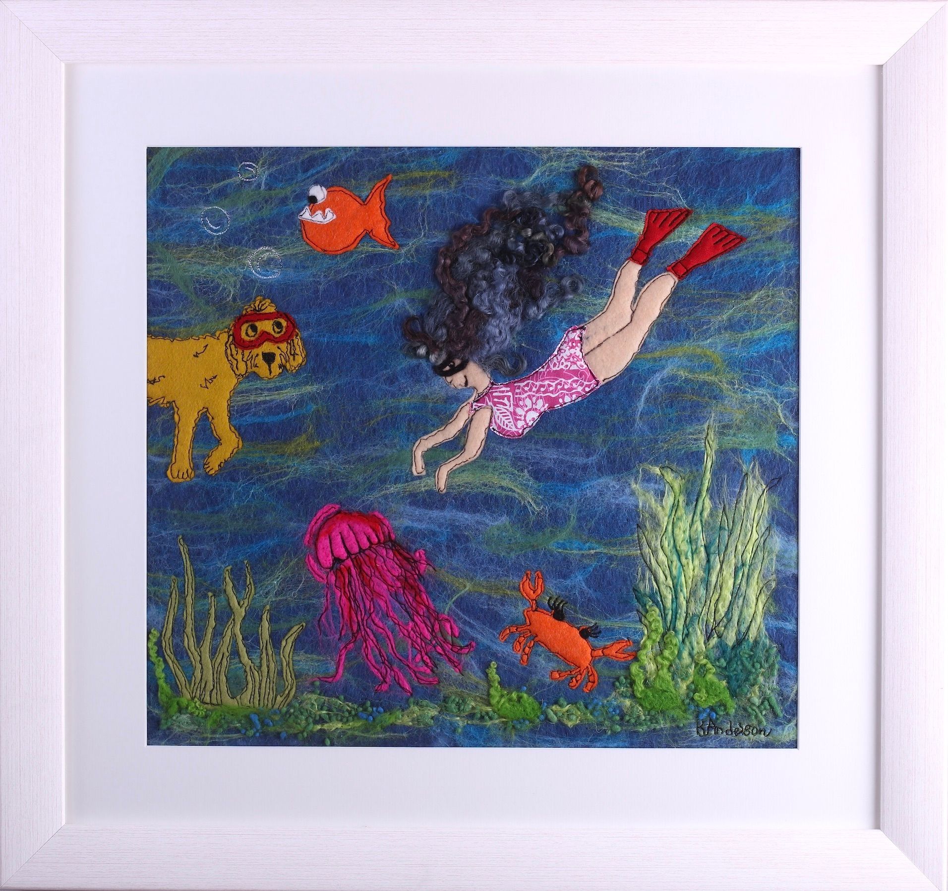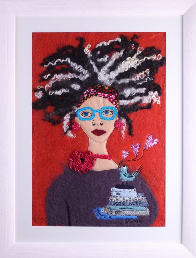 Needle and wet felted picture with merino and mulberry silk fibres, textiles with free motion stitching.