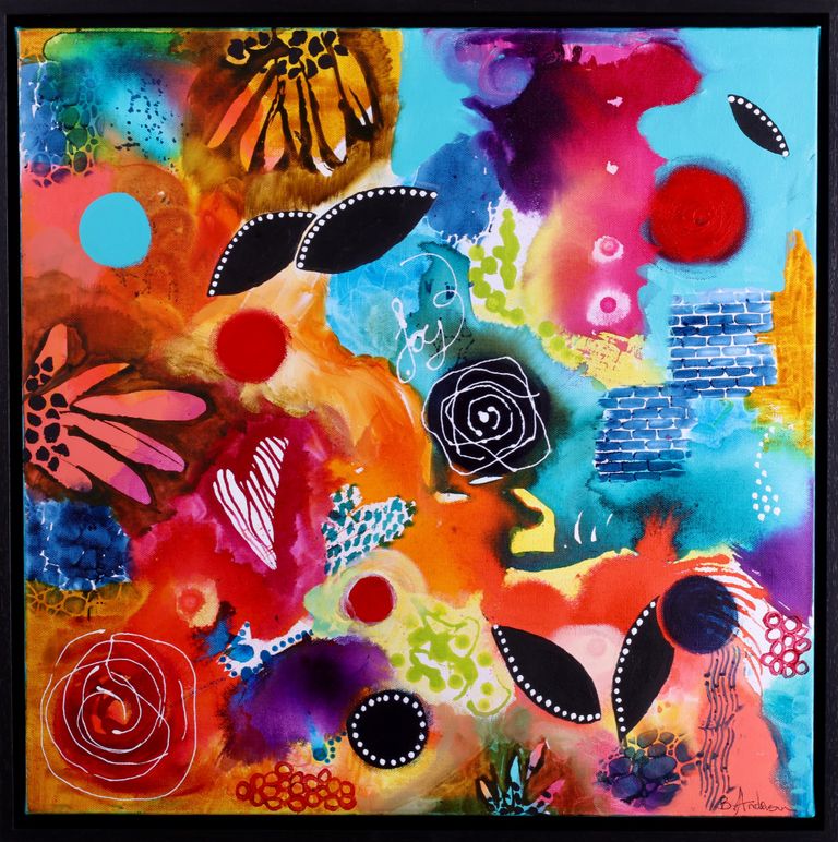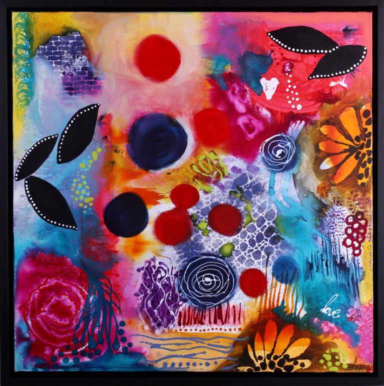 Mixed media Acrylics,inks & collage on deep edge canvas in a matt black wooden floating frame