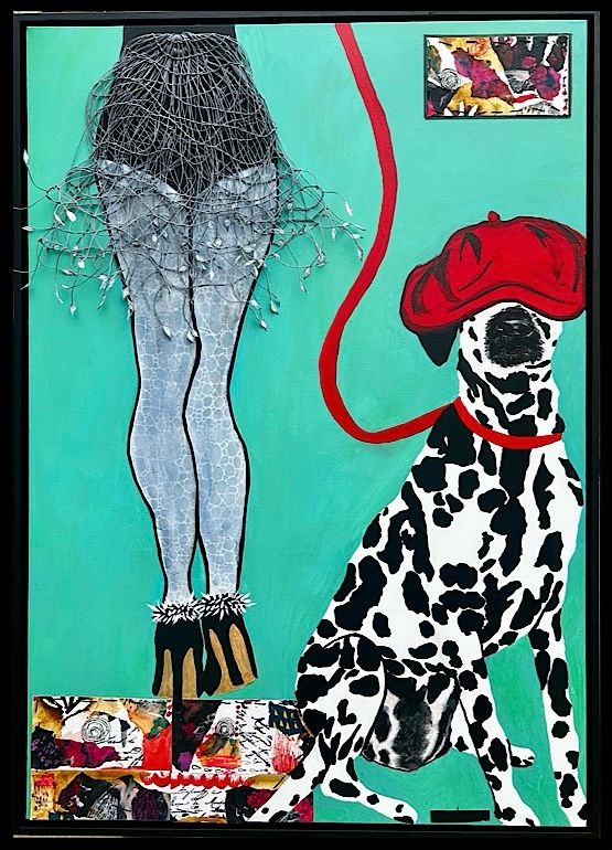Mixed media acrylic ink and paint, and collage on deep edge canvas, skirt handmade woven from fine paper twine