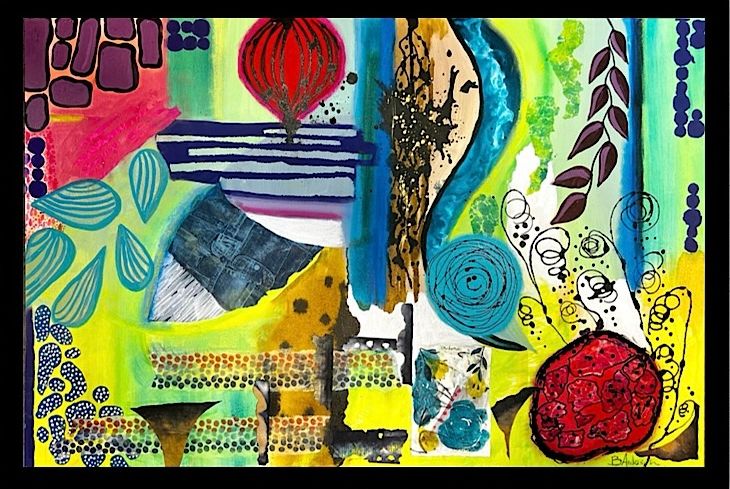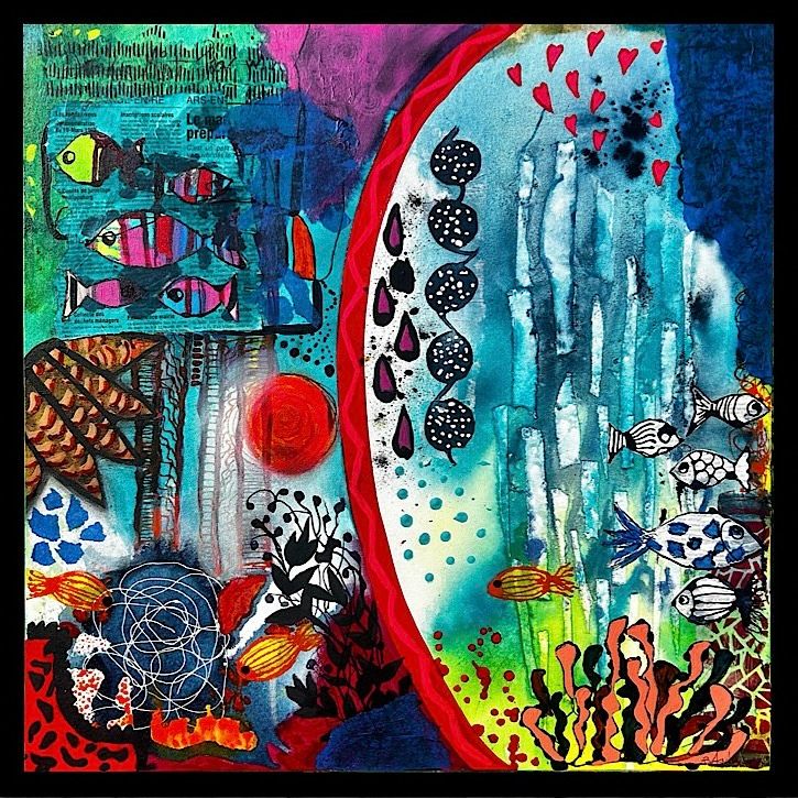 Mixed media acrylic ink and paint, and collage on deep edge canvas